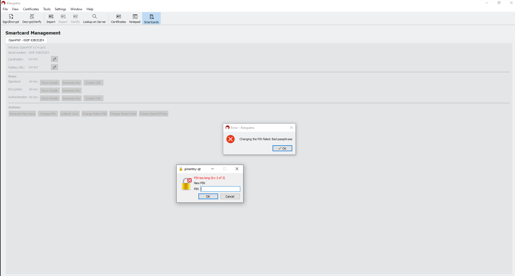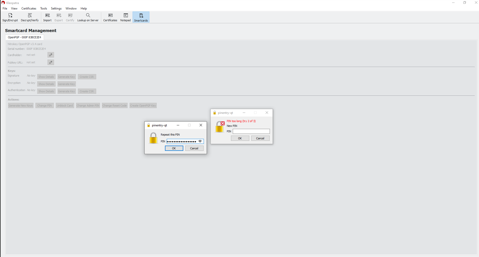 I am unable to set the user PIN to its maximum supported length of 127 characters, as mentioned in the Nitrokey documentation. PINs up to around 88 characters work fine, but anything beyond that length is rejected.