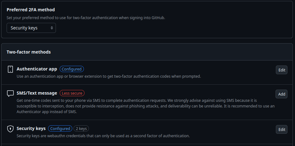 I actually originally set it up that way because I accidentally missed the distinction on GitHub. However, after realizing that I definitely didn’t want to leave the current state as it was due to the associated security concerns, I deleted the keys as passkeys and set them up as security keys.