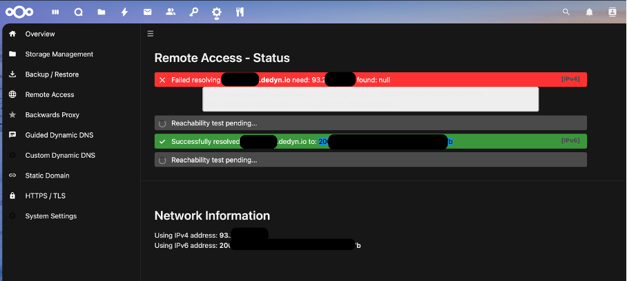 Wenn ich den Remote-Access Status aufrufe wird IPv6 grün dargestellt und IPv4 rot. Die Reachability-Tests laufen dauerhaft, ohne je in einen Fehler zu kommen.