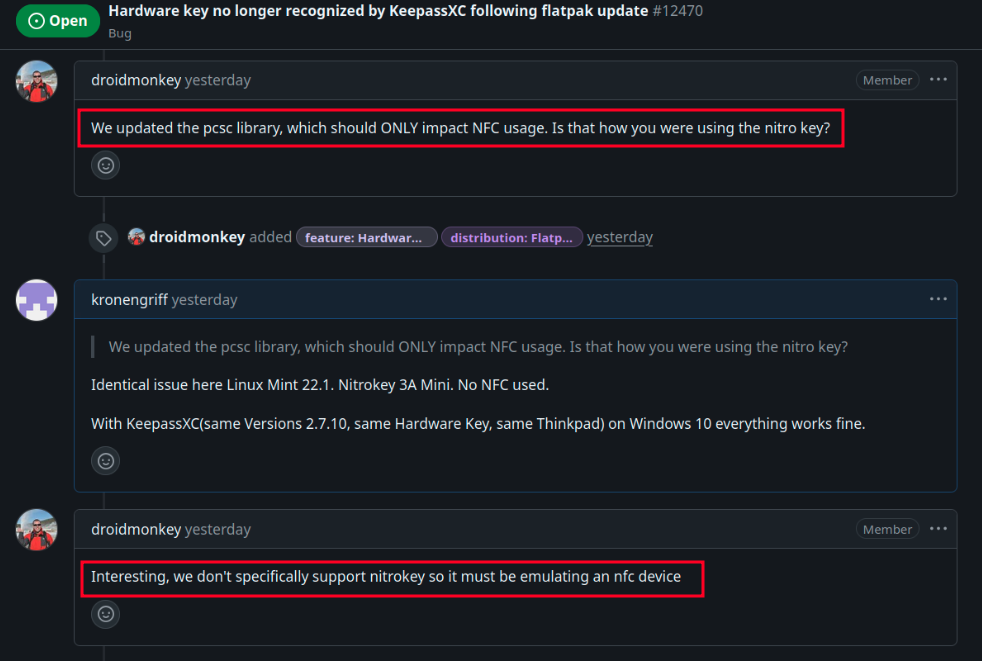 My Nitrokey 3C NFC stopped being detected by KeepassXC after upgrading to the latest flatpak (commit 3f6ba9832930f879ff7f80521b8d122e60dd933a9bd00098154c844c0fb6b138); I’m running ubuntu 2024.04. The release notes say Update pcsc-lite to 2.3.3, so I wondered whether this is an issue on the KeepassXC (the KeepassXC version didn’t change) side or with the pcsc libraries.