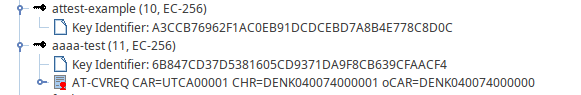 In this screenshot, attest-example was generated via ./scriptrunner key-attestation.js and aaaa-test was generated via pkcs11-tool.