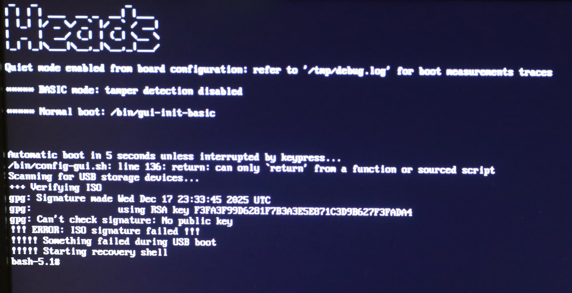 I then attempted a clean install to Q4.3 but it failed when trying a USB with an ISO put on the USB using dd. That failed - could not find the USB but that same USB was used successfully to perform a clean install of Q4.3 on another Nitrokey computer without heads (an older Nitropro I think - with the mini-form factor). I then tried installing using a USB with an ISO and a detached *.asc file and that failed because the signatures were not verified.