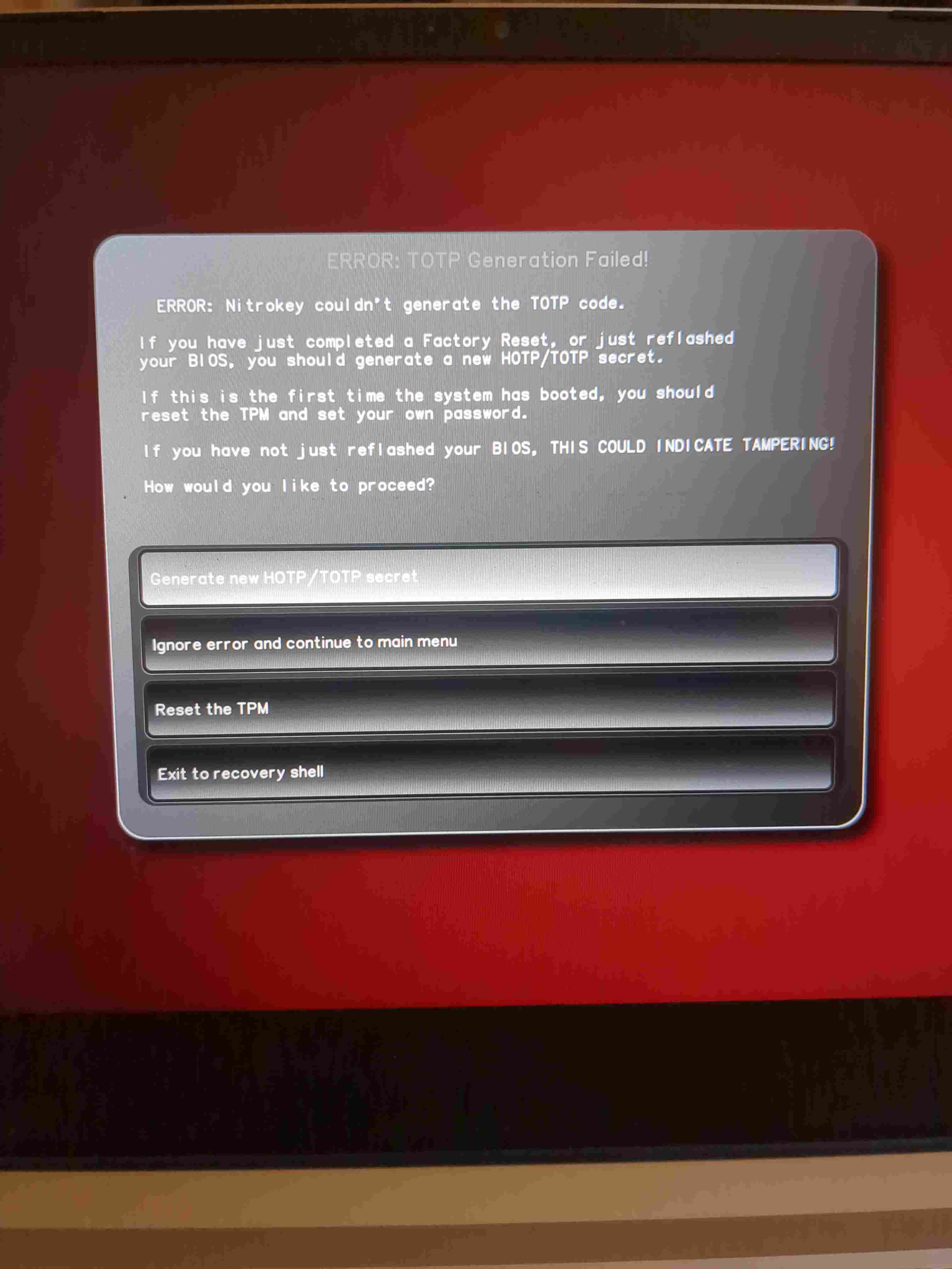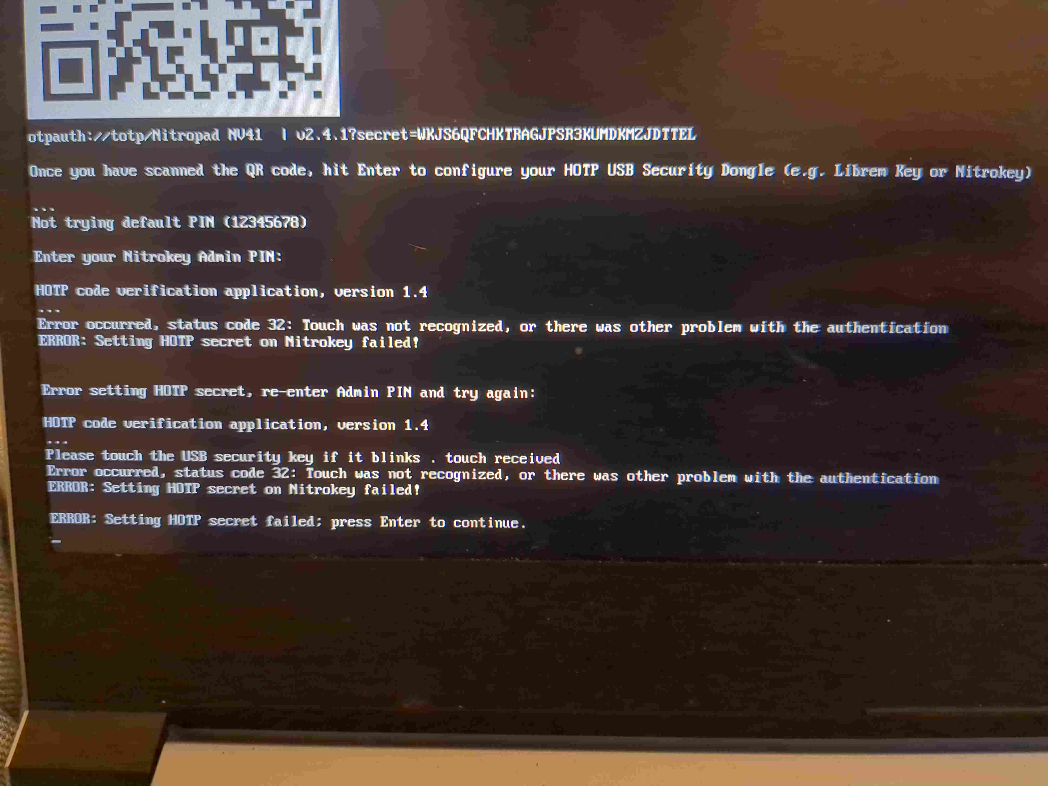 After restarting the system says: Nitrokey coulndt generate totp code. then i try to generate hotp/totp secret, enter the TPM owner pw (12345678), enger nitrokey admin key (12345678), it blinks, i touch, thrn error status code 32, touch was not recognized or tgere was other Problem with the authentication error setting hotp secred on nitrokey failed